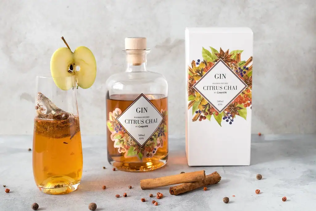 Carmién Citrus Chai Rooibos Gin. Juniper berries and a touch of Citrus are the signature botanicals in this smooth gin, distilled with a fragrant blend of Rooibos, Honeybush, Cinnamon, Cloves, Nutmeg and Blackpepper. Fresh on the palate with subtle hints of spice and citrus.
