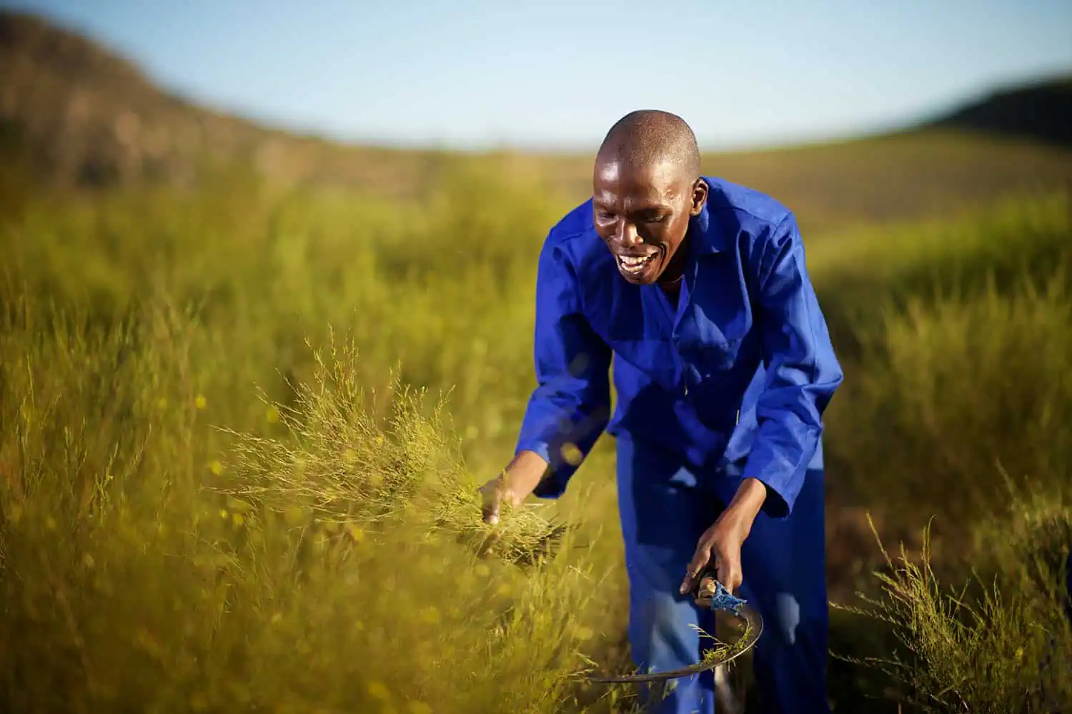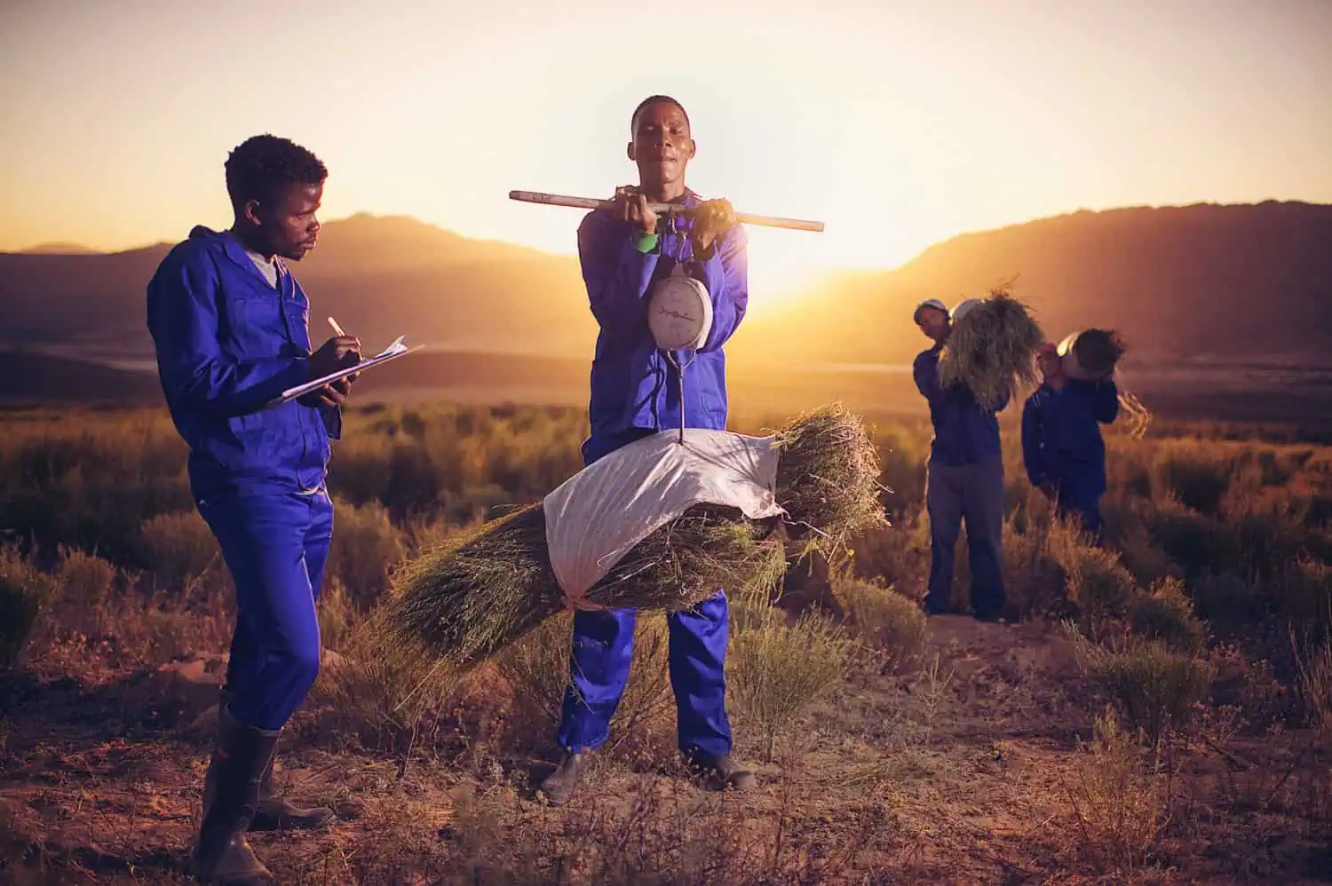 5 am. Before the sun has lifted its head behind the Cederberg mountains, sickles are rhythmically cutting handfuls of rooibos. 50 men a field. Each bundle carefully laid on a small sail until it is full. Two hooks join the cuttings into a sheaf that can stand on its own.