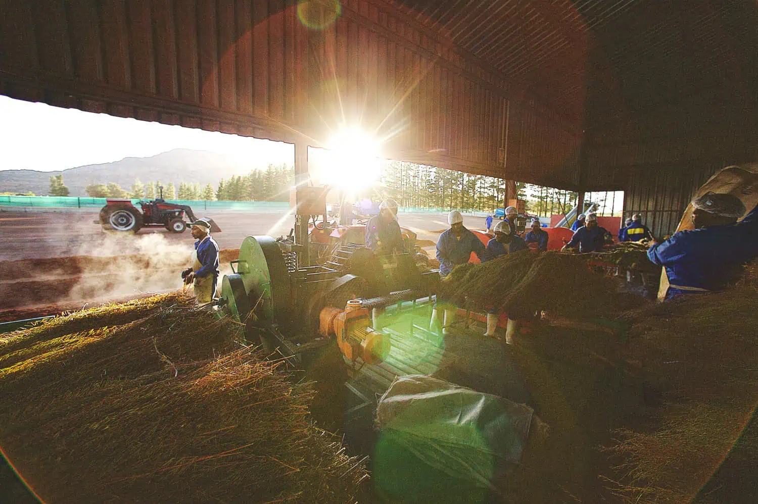6 am. Higher up in the valley at Bergendal Rooibos, long rows of cut, fermenting tea have been building up steamy temperatures of up to 42 degrees Celsius overnight. As the covering sails are lifted and the tea is given one more turning over, a thick mist rises up, obscuring your view, and that familiar sweet rooibos smell permeates the air. It is a beautiful experience. What landed on the court yesterday as green tea, has now miraculously turned red. The wonder of rooibos.