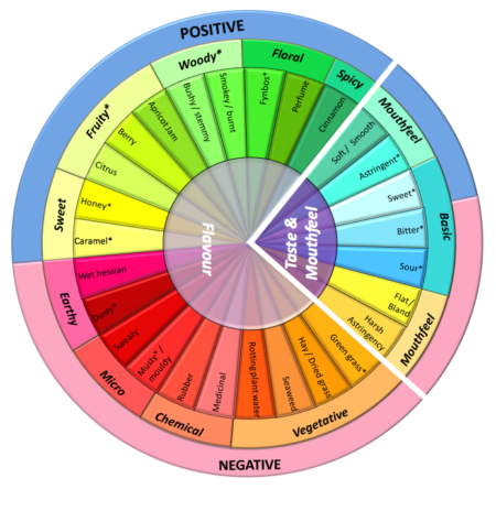 It is important to train the tasting panel on tasting constants and to be calibrated in tasting against each other and identifying the correct basic characteristics of fermented rooibos. This is done according to the Rooibos Aroma Flavour wheel below.