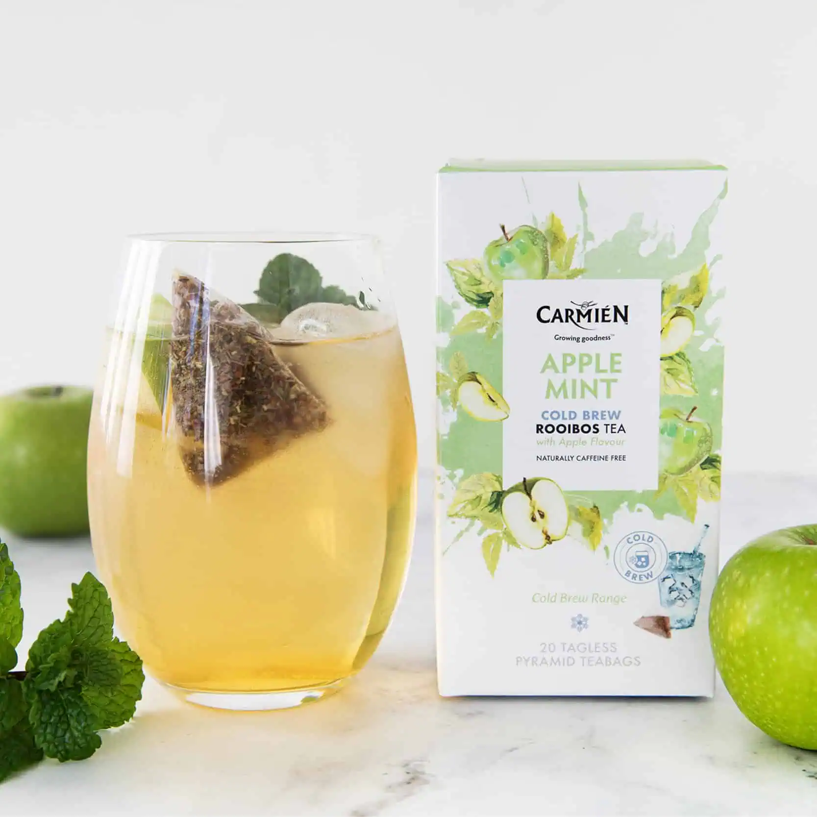 Carmién Apple Mint flavoured cold brew rooibos tea is a delicious burst of crisp apple flavours with a hint of mint that steeps quickly from a beautiful yellow to orange. No sugar is added, only natural Stevia leaf, making the cold brew a much healthier option to be enjoyed by the whole family. Simply add a teabag or two to your water bottle or travel cup and enjoy as a refreshing cold drink on-the-go. Live life with Carmién, your essential lifestyle partner. Shop our full range for an active lifestyle here.