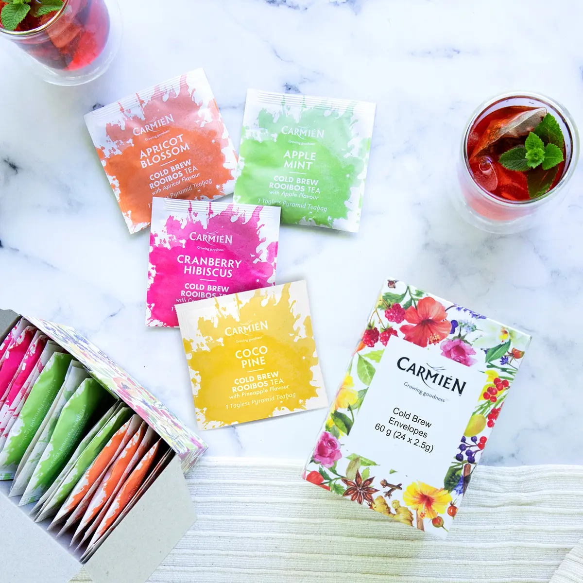 Our Cold Brew Rooibos Tea Envelopes box contains our 4 delicious Cold Brew rooibos teas in 6 individual envelopes each. The flavours are Apple Mint, Cranberry Hibiscus, Apricot Blossom and Coco Pine.