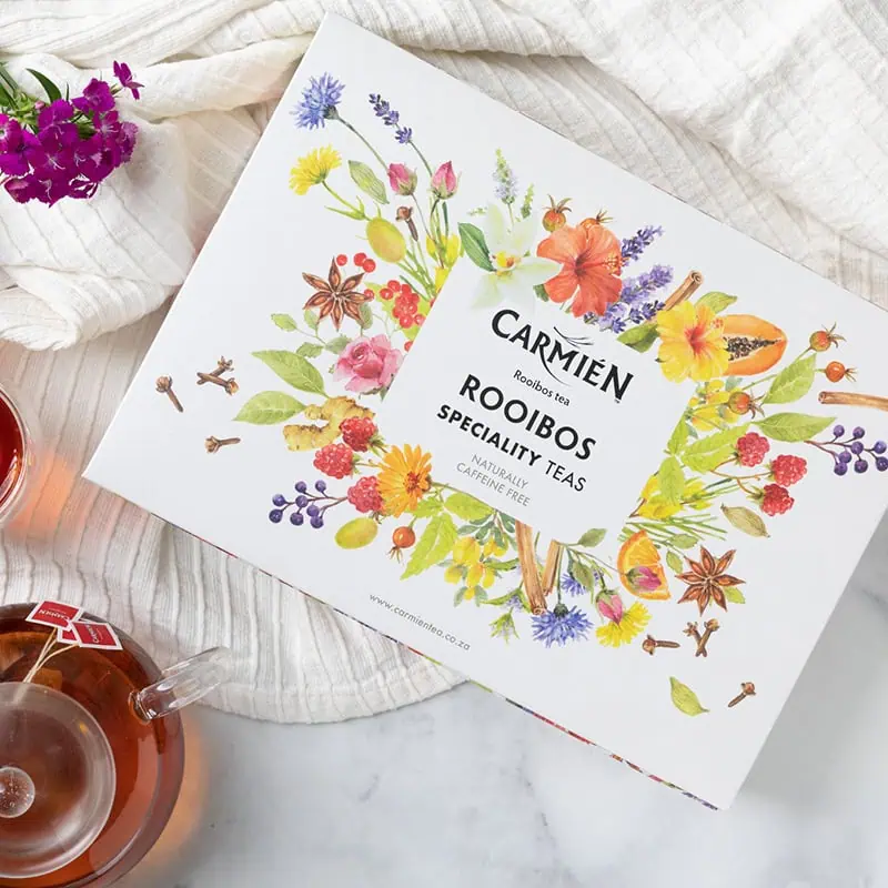Organic Carmién Tea South African herbal tea with indigenous Rooibos and Honeybush for natural health benefits. Perfect for wellness and relaxation, crafted from pure, sustainable ingredients.