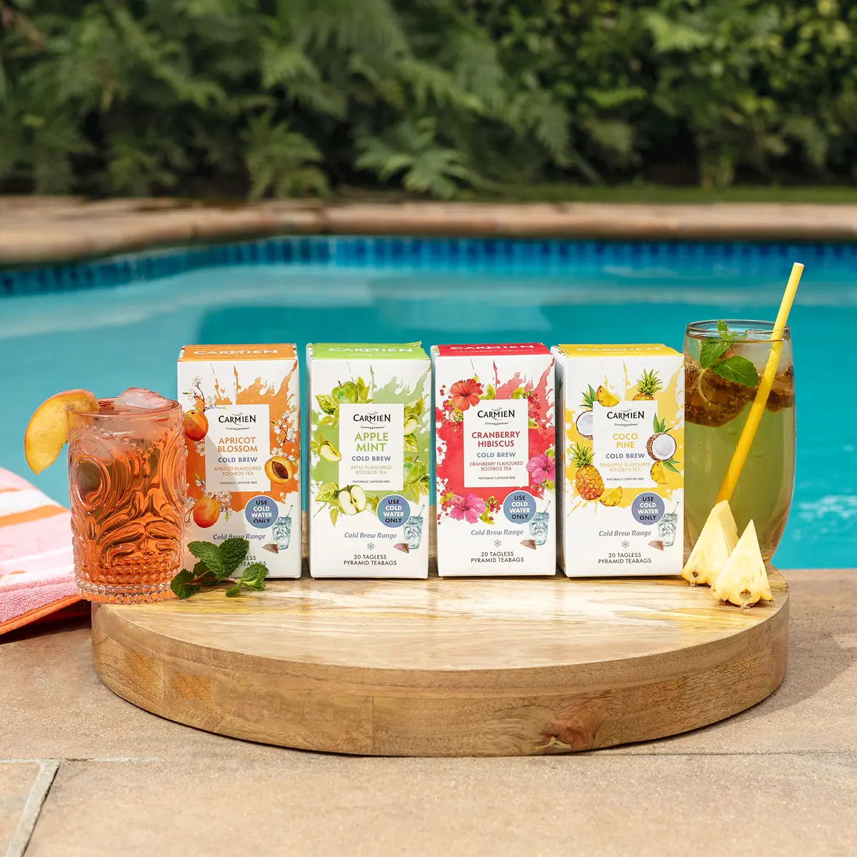 Refreshing, well-balanced, sweet-tart blends of rooibos and granulated flavours with finely cut dried fruit pieces. Specially developed to be brewed in cold water. Naturally sweetened with stevia leaf.