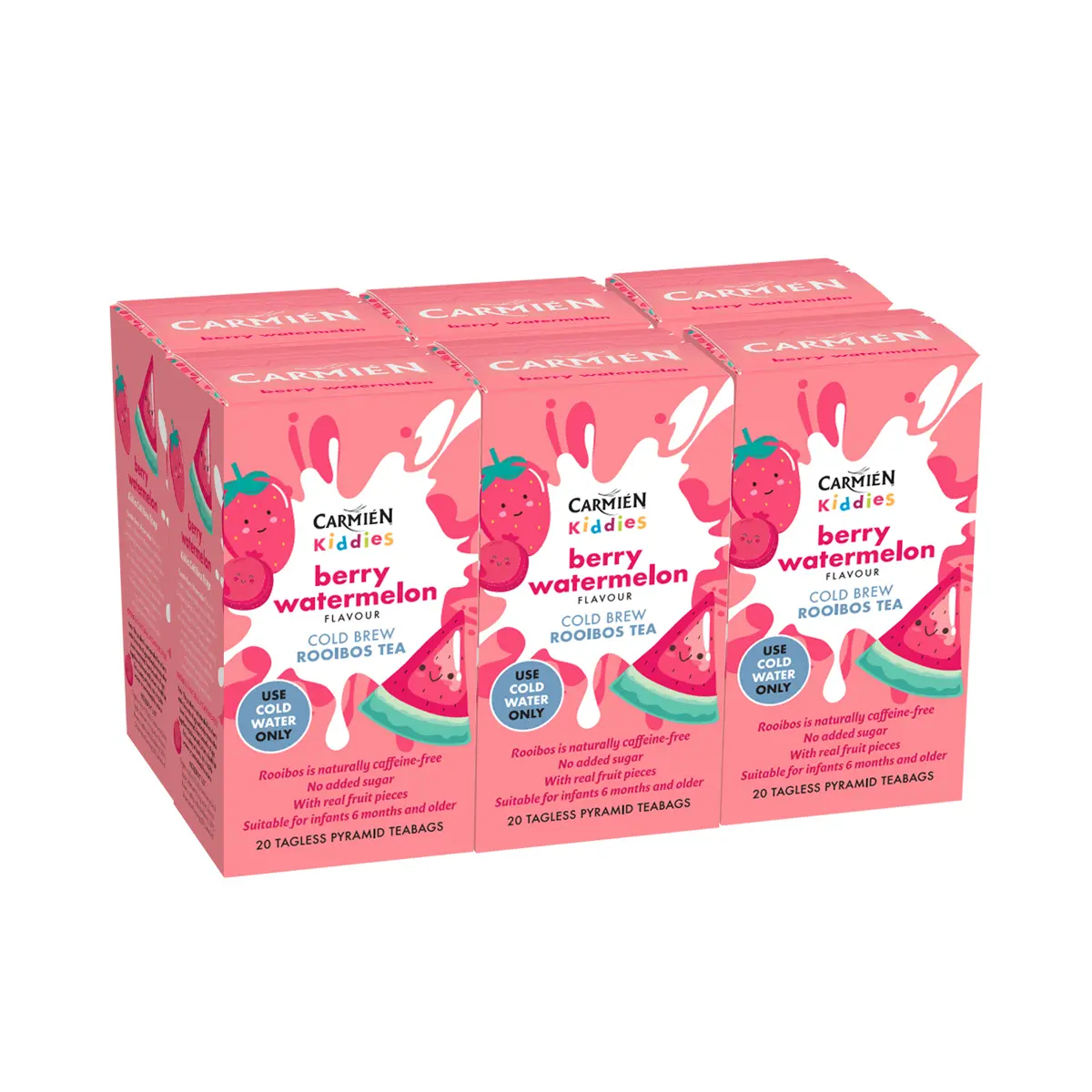 Our delicious Berry Watermelon flavoured kiddies cold brew rooibos tea in a convenient bulk pack including six boxes of twenty teabags.