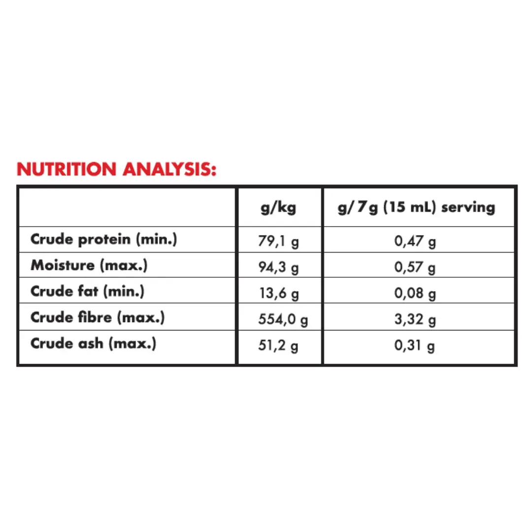 Use 15 ml (1 Tablespoon) powder per 10 kg body weight and sprinkle over pet’s food as a tasty addition OR mix 15 ml (1 Tablespoon) powder with a little bit of water to make a paste, then mix into pet food.