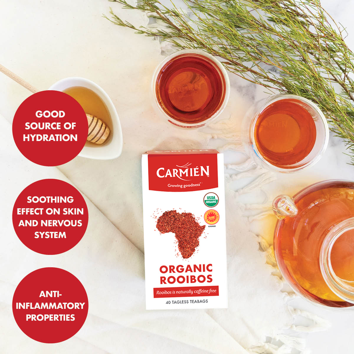 Carmién Organic Pure Rooibos is a superior, well-balanced tea with a natural full aroma and soft, sweet taste. This tea is organically grown and free of pesticides. It’s excellent when on a low-kilojoule diet and a must for the health and fitness-conscious. Rooibos is high in antioxidants, minerals and has multiple health benefits ranging from cancer prevention, improved heart health, digestive health, aiding mineral absorption, improving skin conditions, anxiety, nervousness and sleep.