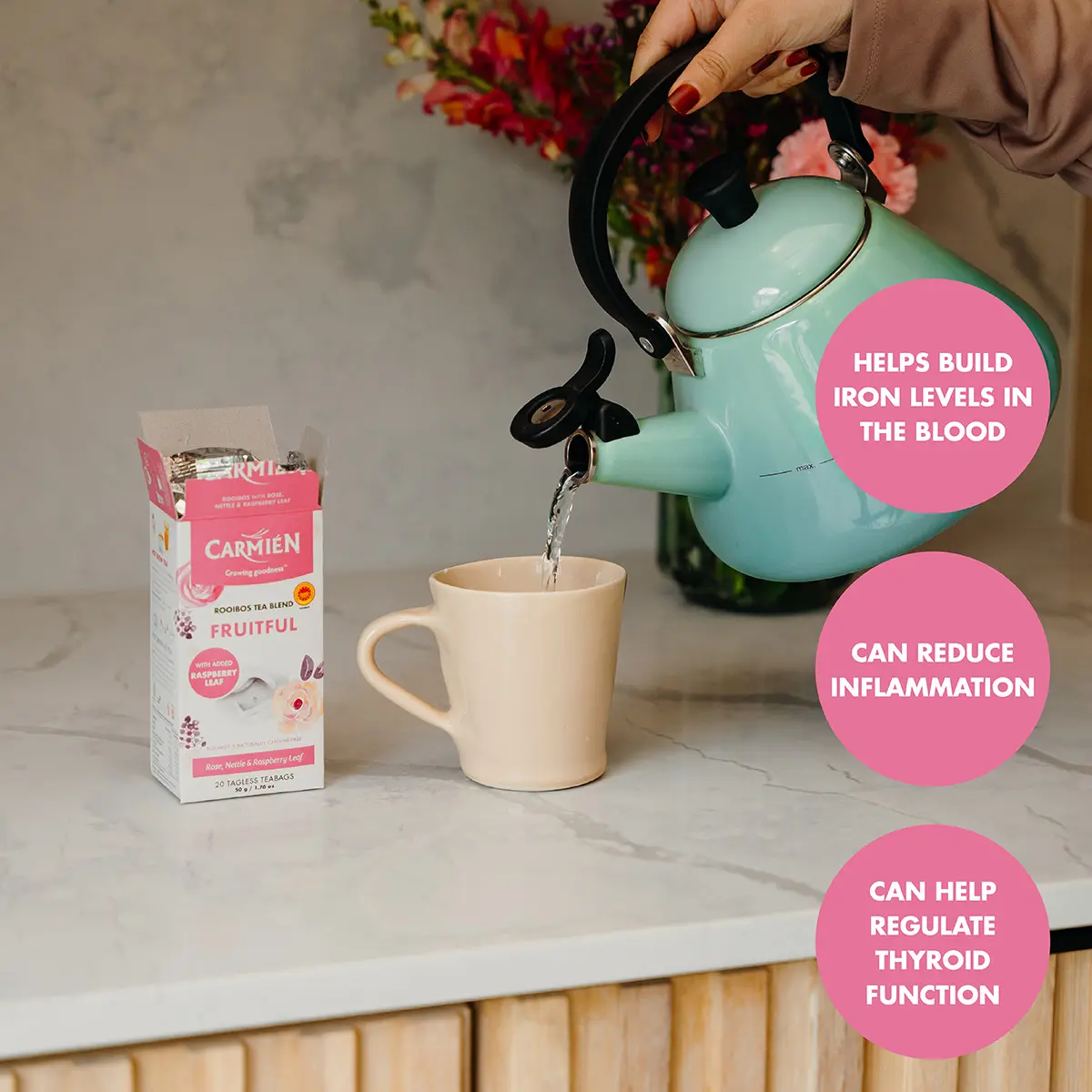 Carmién Fruitful is a specially formulated blend of Rooibos, Raspberry Leaf, Nettle, and Chaste Tree that assists with boosting fertility and balancing hormones. Each box contains 20 compostable pillow teabags, and all packaging is recyclable.