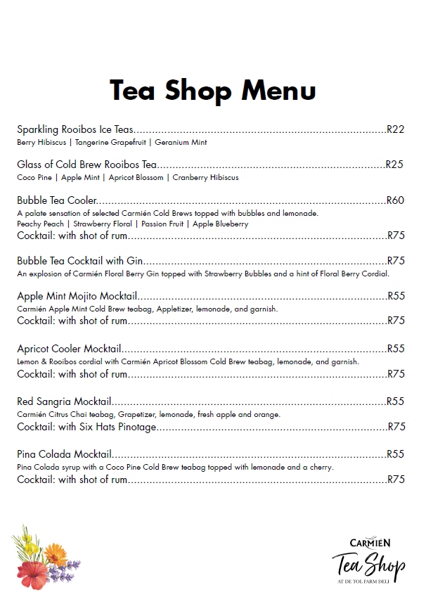Experience rooibos like never before at the Carmién Tea Shop at De Tol Farm Deli, located on top of the Piekenierskloof Pass, N7.