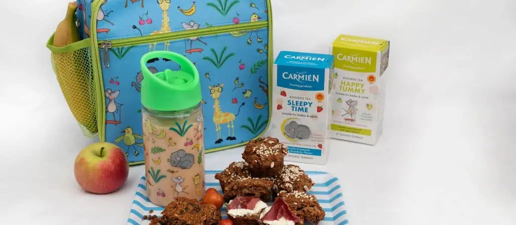 To quench their thirst a refreshing rooibos tea drink will be ideal. This is where Carmién Tea’s kiddies range comes to the rescue. The combo consists of Very Berry containing rooibos with berry flavours, Sleepy Time, with rooibos & chamomile with a strawberry flavour and Happy Tummy with rooibos and flaxseed with an apple flavour. The Happy Tummy with the flaxseed will add extra wholesomeness when making the muffins as well as the crunchies while the Very Berry and the Sleepy Time can be used for making cold rooibos tea drinks as well as adding flavour and extra goodness to cold milkies which are also wonderful to pack into the lunch box.